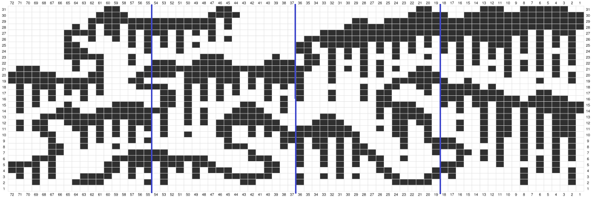 - Ota työhön mukaan tässä kohtaa valitsemasi kuvioneule ja neulo varren kirjoneuleosuus. Neulo kaavion A kaikki kerrokset. Kaaviota luetaan alhaalta ylös, oikealta vasemmalle. Kaavion siniset viivat osoittavat puikkojakoa. (Vinkki: Kaaviossa on pitkiäkin langanjuoksuja, joten muista sitoa langat aina tarvittaessa työn nurjalla puolella.)