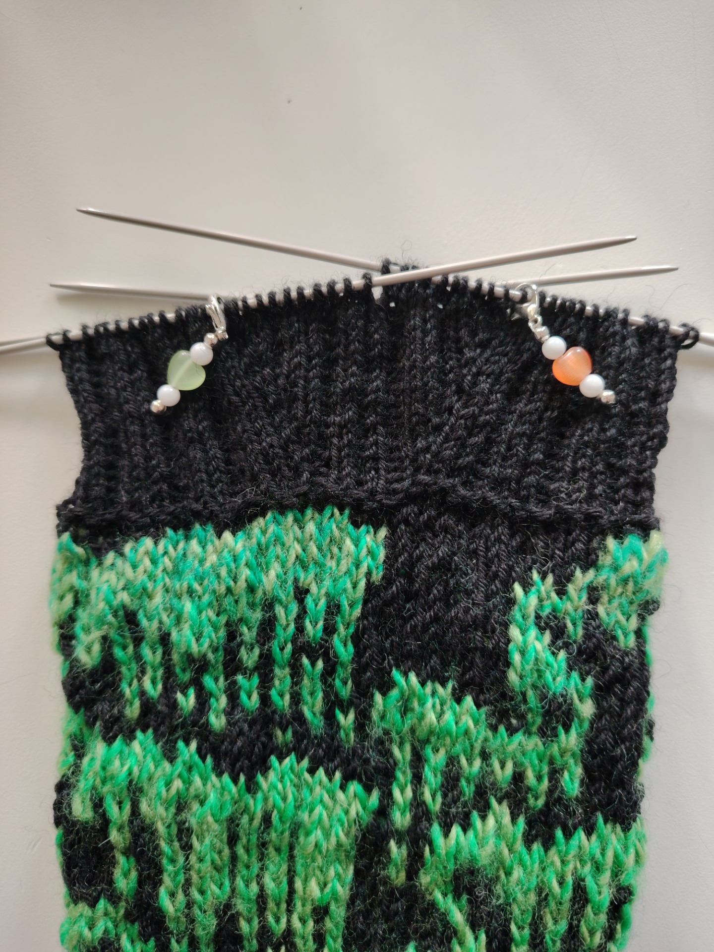 - 2krs: Neulo joustinneuletta koko kerros. lisätyt silmukkamerkit mukailevat joustinneuletta, joten neulo ne kohdalle osuessa 3o,1n joustinneuleen mukaisesti joko nurin tai oikein. Siirrä silmukkamerkit niiden osuessa kohdalle.