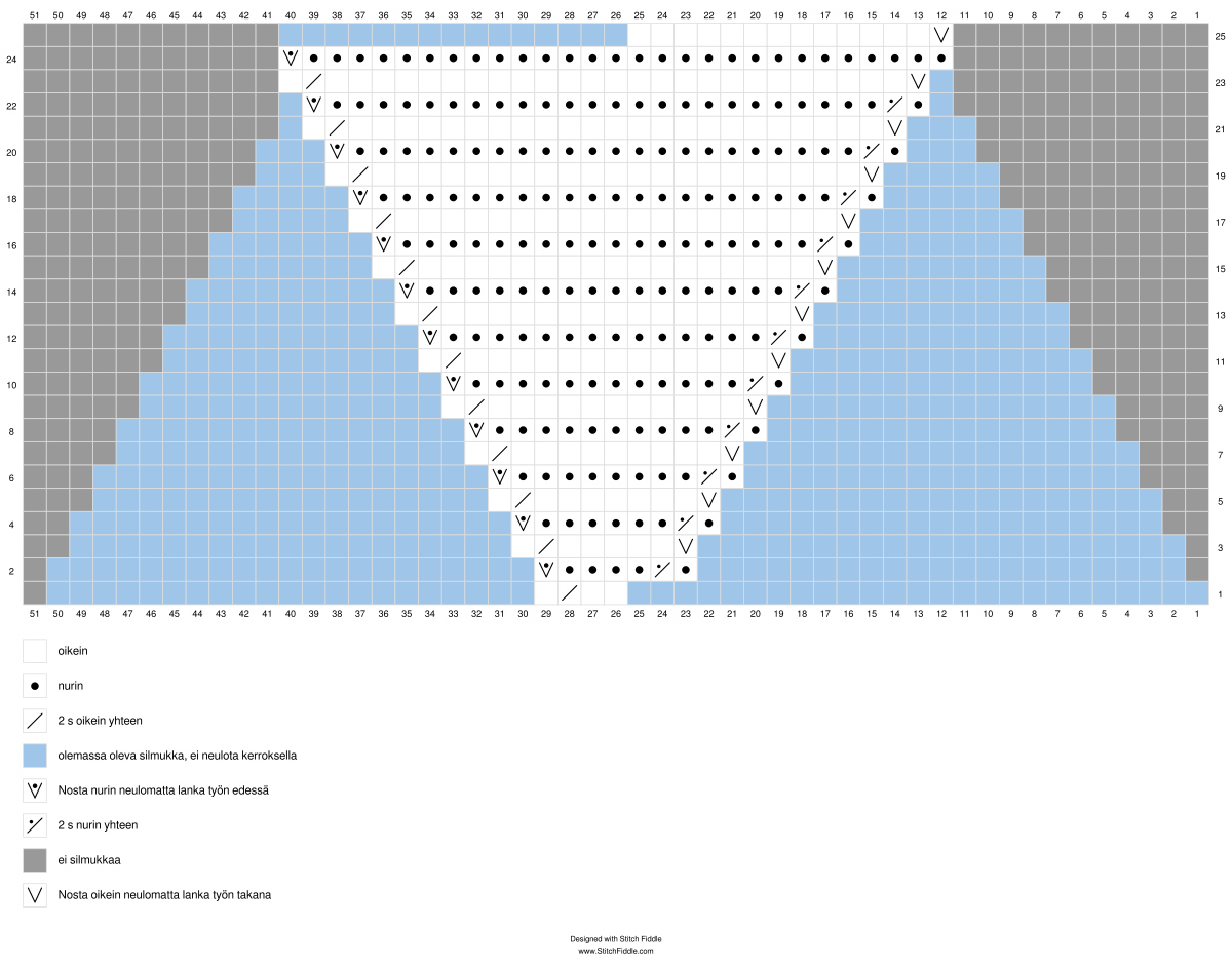 - Neulottuasi kaavion kaikki kerrokset katkaise kuviolanka, neulo 2 krs oikein ja sitten 1 krs nurin. Kavenna nurjalla kerroksella joka puikolta 1 s. (68 s)